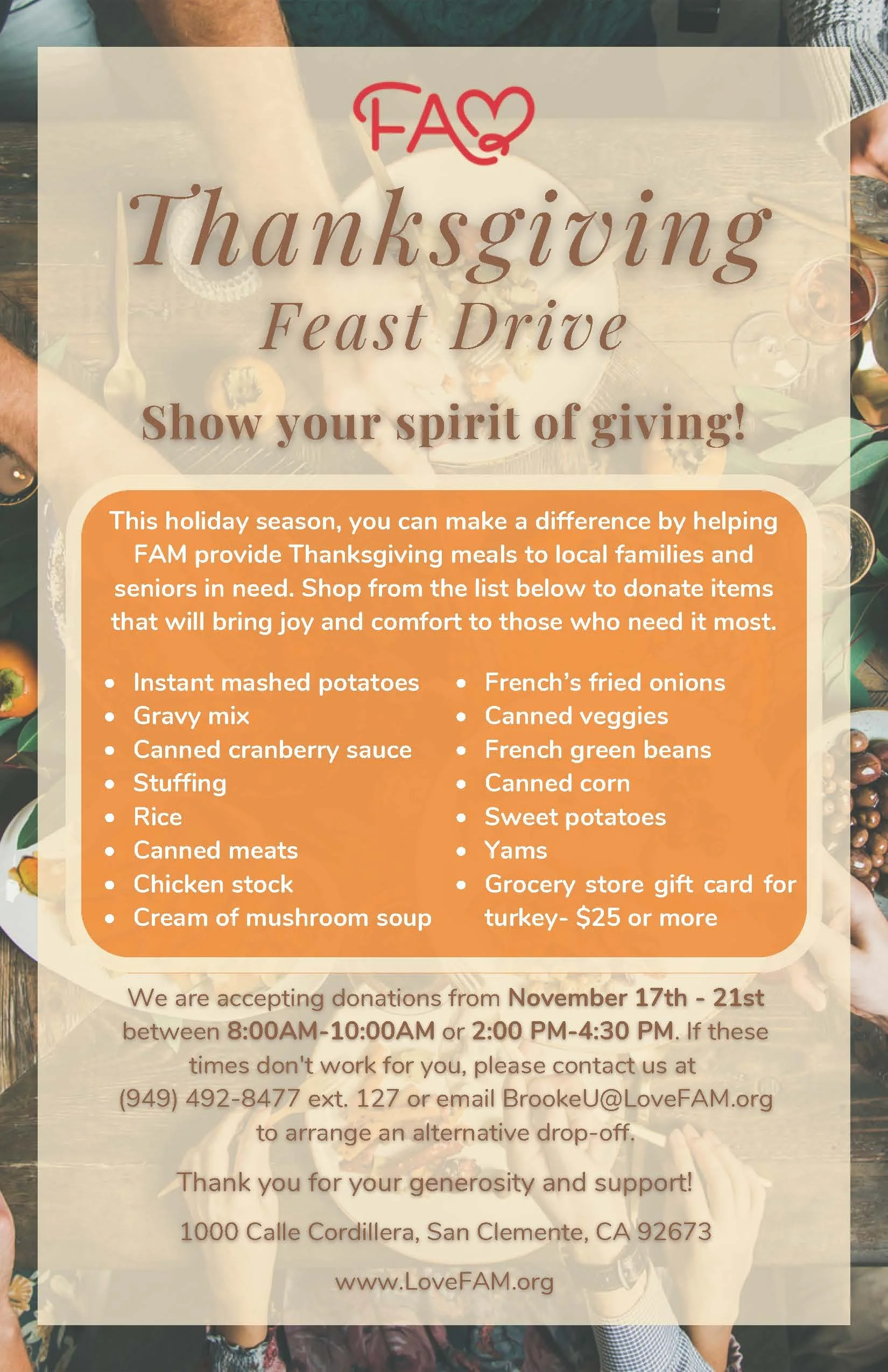 If you’d like to coordinate an alternative drop-off time or host your own Thanksgiving food drive, please contact us at (949) 492-8477 ext. 127 or email BrookeU@LoveFAM.org.